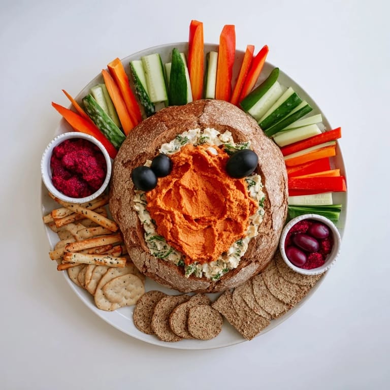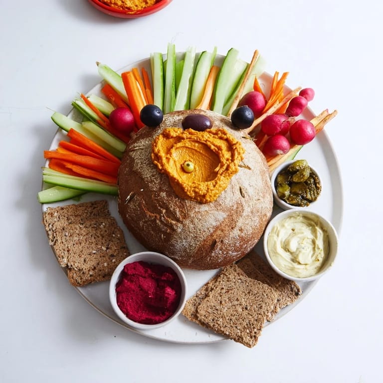 Use a small round loaf as the base, spread dips on top, and insert vegetable sticks upright to mimic spines, finishing with olives and a cherry tomato for face details.