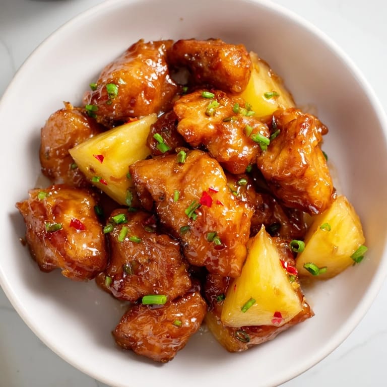 Save A sweet and tangy Hawaiian-inspired dish with juicy chicken pieces baked in a caramelized brown sugar, soy sauce, and pineapple glaze. Tender pineapple chunks add tropical flair, making this meal perfect for weeknights or special occasions.