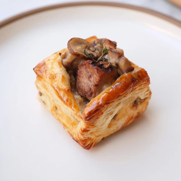 Ensure the mushroom duxelles is cooked thoroughly to evaporate moisture before assembly. Using a dry filling keeps the pastry crisp and flaky.