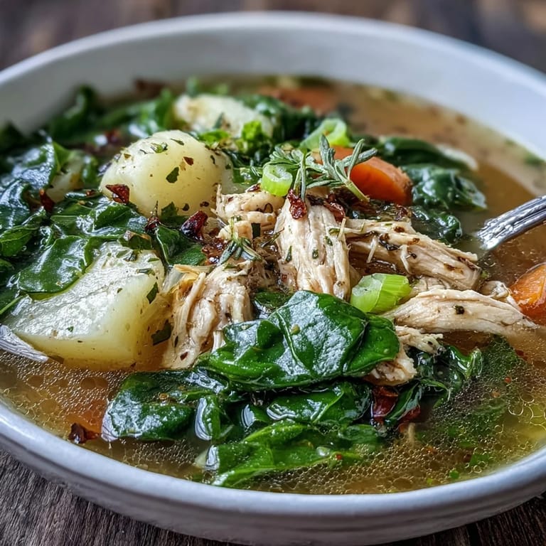 Save There's something about a pot of soup simmering on the stove that makes a kitchen feel like home, and this collard greens and chicken soup does exactly that. My neighbor brought me a bunch of fresh collard greens from her garden one fall afternoon, and I wasn't quite sure what to do with them until I thought about what my grandmother used to make on cool evenings. This version came together organically, combining tender shredded chicken, creamy potatoes, and those earthy greens in a broth that somehow tastes like both comfort and nourishment at once.