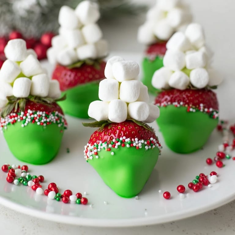 Save Festive, whimsical strawberries dipped in chocolate and decorated to resemble charming elf hatsโa delightful holiday treat perfect for parties and gifting.