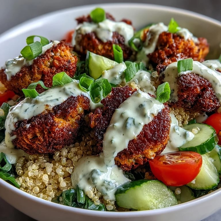 Save My friend Sarah brought this bowl to a potluck during one of those late-summer evenings when everyone's tired of heavy food, and I watched people go back for seconds without hesitation. There's something about the combination of crispy baked falafel and fluffy quinoa that just works, especially when you drizzle that creamy garlic tahini sauce over everything. I've made it dozens of times since, tweaking it here and there, but the core magic stays the same. It's the kind of dish that feels fancy enough for guests but simple enough that I make it on random Tuesdays when I need something nourishing. The golden falafel almost steams when you bite into it, giving way to the herbaceous center that makes you taste parsley and cilantro in the best way.