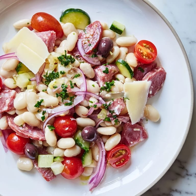 Save There's something about assembling a salad that doesn't require any cooking that makes you feel like you've uncovered a kitchen secret. My neighbor Marco once brought over a version of this antipasto salad on a humid summer evening, and I watched him toss everything together in about ten minutes while we chatted about his garden. The way the beans soaked up that bright vinaigrette, how the salami got a little softer and more flavorful as it sat—it completely changed how I thought about what a substantial salad could be.