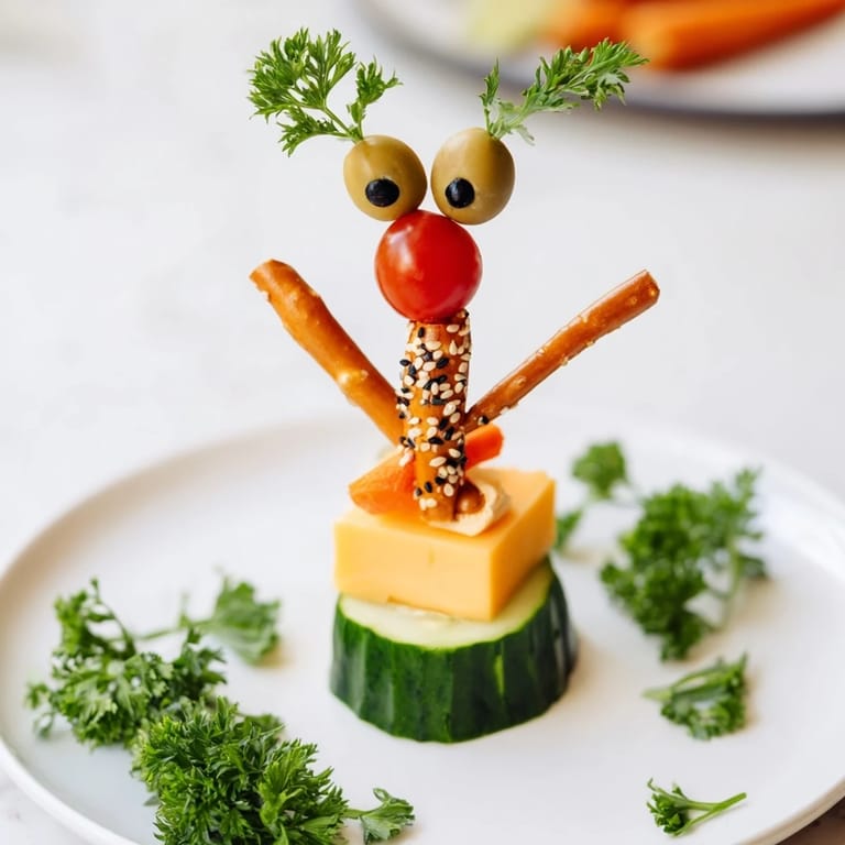 - Insert a pretzel rod upright into the stack for the neck, gently pressing it into the cheese and vegetable layers for stability.