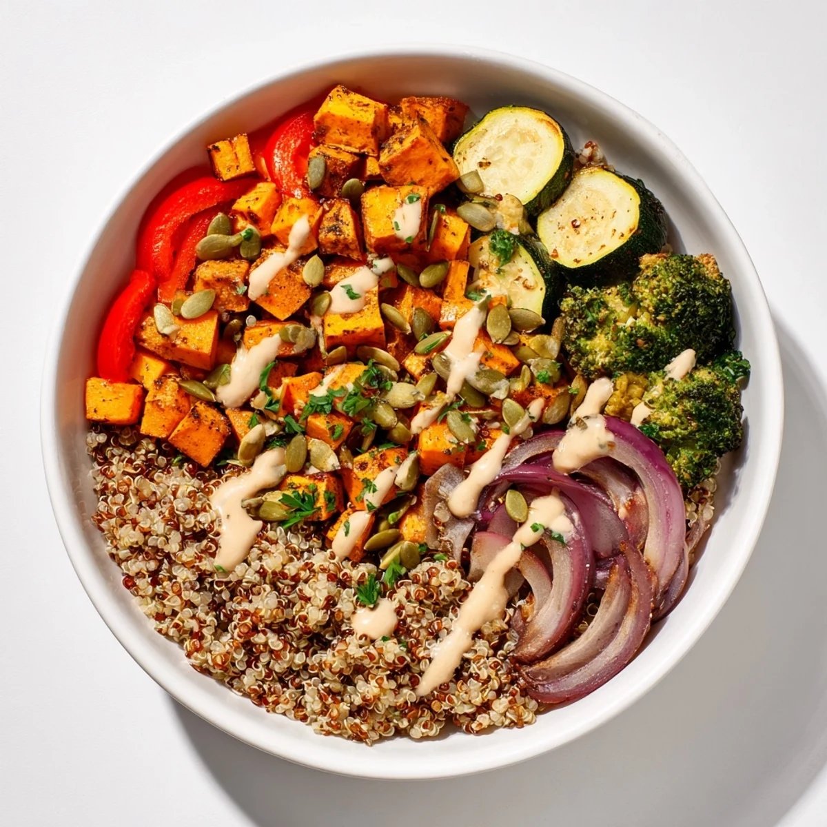 Save A vibrant, healthy bowl featuring nutty quinoa and a medley of roasted seasonal vegetables, topped with a zesty lemon-tahini dressing. Perfect for meal prep or a light lunch.