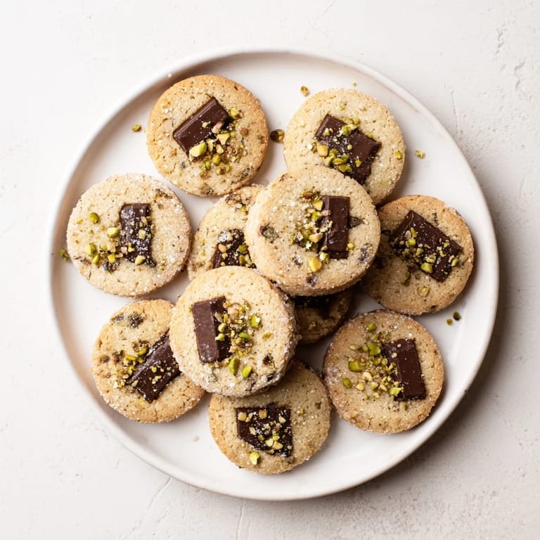 Save Buttery, tender shortbread cookies studded with roasted pistachios and rich chocolate chunks, finished with flaky sea salt. Perfect for gifting, celebrations, or a luxurious treat with tea or coffee.